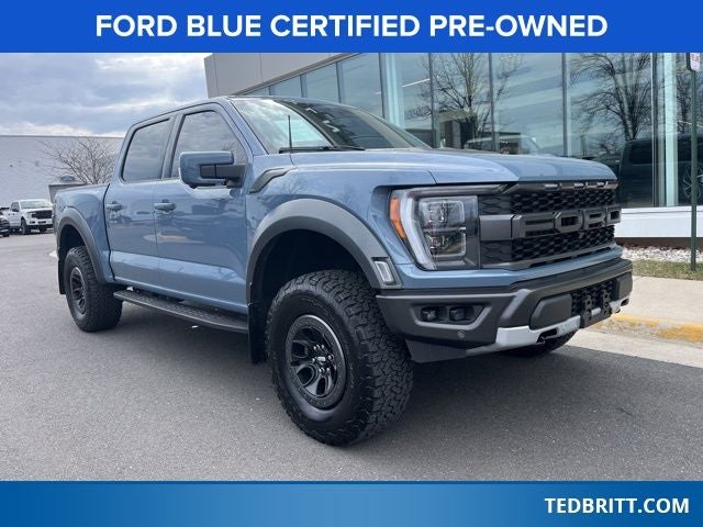 Equipment Group 801A Standard, GVWR: 7,300 lbs Payload Package, Raptor Exterior Graphics Package, Ford Blue Certified Certified, 4WD, 17 Cast Aluminum Wheels, 17 Forged Aluminum Bead-Lock Capable Wheels, 18 Speakers, 4-Wheel Disc Brakes, ABS brakes, Adaptive suspension, Adjustable pedals, Air Conditioning, Alloy wheels, AM/FM radio: SiriusXM with 360L, Auto High-beam Headlights, Auto tilt-away steering wheel, Auto-dimming door mirrors, Auto-dimming Rear-View mirror, Automatic temperature control, Brake assist, Bumpers: body-color, Compass, Cruise Control / Speed control, Delay-off headlights, Driver door bin, Driver vanity mirror, Dual front impact airbags, Dual front side impact airbags, Electronic Locking w/4.10 Axle Ratio, Electronic Stability Control, Emergency communication system, Exterior Parking Camera Rear, Front anti-roll bar, Front Bucket Seats, Front Center Armrest, Front dual zone A/C, Front fog lights, Front reading lights, Front wheel independent suspension, Fully automatic headlights, Garage door transmitter, Heated door mirrors, Heated front seats, Heated rear seats, Heated steering wheel, Illuminated entry, Inclination/Intrusion Sensor Removal, Lane Departure Warning System, Leather Trim Seats w/Heated 2nd Row, Low tire pressure warning, Memory seat, Navigation system: Connected Navigation, Occupant sensing airbag, Outside temperature display, Overhead airbag, Overhead console, Panic alarm, Passenger door bin, Passenger vanity mirror, Pedal memory, Power door mirrors, Power driver seat, Power passenger seat, Power steering, Power windows, Radio data system, Radio: B&O Unleashed Sound System by Bang & Olufsen, Rain sensing wipers, Rear reading lights, Rear step bumper, Rear window defroster, Remote keyless entry, Security System, Speed-sensing steering, Split folding rear seat, Steering Wheel Heat Removal (DISC), Steering wheel memory, Steering wheel mounted audio controls, SYNC 4 w/Enhanced Voice Recognition, Tachometer, Telescoping steering wheel, Tilt steering wheel, Traction control, Trip computer, Turn signal indicator mirrors, Variably intermittent wipers, and Ventilated front seats