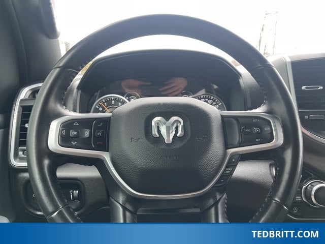 Quick Order Package 23Z Big Horn (Big Horn Badge), Ford Blue Advantage: Blue Certified Certified, 3.21 Rear Axle Ratio, 48V Belt Starter Generator, Brake assist, Bumpers: chrome, Compass, Convex Wide-Angle Mirror Insert, Cruise Control / Speed control, Delay-off headlights, Electronic Stability Control, Front fog lights, Front License Plate Bracket, Fully automatic headlights, Heated door mirrors, MOPAR Front & Rear Rubber Floor Mats, Remote keyless entry, Variably intermittent wipers, Wheels: 20 x 9 Aluminum Chrome Clad (WRK), 3 Rear Seat Head Restraints, 4 Way Front Headrests, 4-Wheel Disc Brakes, 6 Speakers, ABS brakes, Air Conditioning, Alloy wheels, AM/FM radio, Black Exterior Mirrors, Cloth Bench Seat, Driver door bin, Dual front impact airbags, Dual front side impact airbags, Emergency communication system: SiriusXM Guardian, Front anti-roll bar, Front Center Armrest w/Storage, Front reading lights, Front Seat Back Map Pockets, Front wheel independent suspension, Global Telematics Box Module (TBM), GPS Antenna Input, Illuminated entry, Integrated Voice Command w/Bluetooth®, Leather steering wheel, Low tire pressure warning, Occupant sensing airbag, Outside temperature display, Overhead airbag, Overhead console, Panic alarm, ParkView Rear Back-Up Camera, Passenger door bin, Passenger vanity mirror, Power door mirrors, Power steering, Power windows, Radio data system, Radio: Uconnect 3 w/5 Display, Rear 60/40 Folding Seat, Rear anti-roll bar, Rear seat center armrest, Rear step bumper, Split folding rear seat, Steering wheel mounted audio controls, Tachometer, Telescoping steering wheel, Tilt steering wheel, Traction control, Trip computer, and Voltmeter