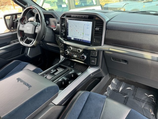 2023 Ford F-150 Black Metallic Raptor Ford Blue Advantage: Blue Certified Certified, 4WD, 17 Cast Aluminum Wheels, 17 Forged Aluminum Bead-Lock Capable Wheels, 18 Speakers, 4-Wheel Disc Brakes, ABS brakes, Adaptive suspension, Adjustable pedals, Air Conditioning, Alloy wheels, AM/FM radio: SiriusXM with 360L, Auto High-beam Headlights, Auto tilt-away steering wheel, Auto-dimming door mirrors, Auto-dimming Rear-View mirror, Automatic temperature control, Blue Interior Package, Brake assist, Bumpers: body-color, Compass, Delay-off headlights, Driver door bin, Driver vanity mirror, Dual front impact airbags, Dual front side impact airbags, Electronic Locking w/4.10 Axle Ratio, Electronic Stability Control, Emergency communication system, Equipment Group 801A Standard, Exterior Parking Camera Rear, Front anti-roll bar, Front Bucket Seats, Front Center Armrest, Front dual zone A/C, Front fog lights, Front License Plate Bracket, Front reading lights, Front wheel independent suspension, Fully automatic headlights, Garage door transmitter, GVWR: 7,300 lbs Payload Package, Heated door mirrors, Heated front seats, Heated rear seats, Heated steering wheel, Illuminated entry, Inclination/Intrusion Sensor Removal, Lane Departure Warning System, Leather Trim Seats w/Heated 2nd Row, Low tire pressure warning, Memory seat, Moonroof & Tailgate, Navigation system: Connected Navigation, Occupant sensing airbag, Outside temperature display, Overhead airbag, Overhead console, Panic alarm, Passenger door bin, Passenger vanity mirror, Pedal memory, Power door mirrors, Power driver seat, Power passenger seat, Power steering, Power Tailgate, Power windows, Radio data system, Radio: B&O Unleashed Sound System by Bang & Olufsen, Rain sensing wipers, Rear reading lights, Rear step bumper, Rear window defroster, Recaro Unique Blue Accent 40/Console/40 Front Seats, Remote keyless entry, Security system, Speed control, Speed-sensing steering, Split folding rear seat, Steering wheel memory, Steering wheel mounted audio controls, SYNC 4 w/Enhanced Voice Recognition, Tachometer, Telescoping steering wheel, Tilt steering wheel, Traction control, Trip computer, Turn signal indicator mirrors, Twin Panel Moonroof, Variably intermittent wipers, Ventilated front seats, 4WD. CARFAX One-Owner. Clean CARFAX. Certified. 4WD 10-Speed Automatic 3.5L V6 EcoBoost